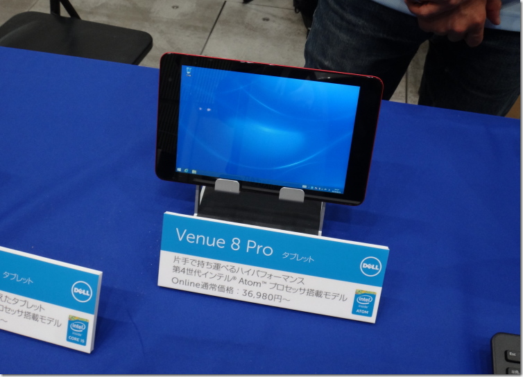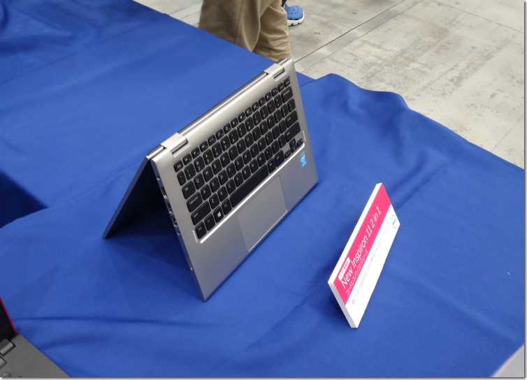 私:「2in1 というのは・・・?」 担:「タブレットとノートの双方を兼ねているタイプです。 今年はディスプレイの裏にキーボードを折りたためるタイプを展示しています」 私:「あー、『ハイブリッド型』とも言われているやつですね。 確かにこの分野はデルさんは強いですもんね。 今年のモデルは見た目はサーフェス(Microsoft のハイブリッド型ノート)に似ていますね」 担:「確かに似ていますが、価格はこちらのモデルの方が安いですよ。 重量も軽いです。(そのぶん CPU 性能は控えめ)」 私:「一体型のモデルの方は、なにか特徴はあるでしょうか?」 担:「ビデオカードを搭載したモデルが増えました。 RADEON R7 を入れています」 私:「モバイル用の RADEON のようですね・・・ ゲームに使うにはちょっと非力な気がしますが、これはそういった用途も考えておられるのでしょうか?」 担:「いや、当社のゲーミングモデルはエイリアンウェアになります。 これは動画編集を考慮しています。 最近は Youtube などに動画を上げる方も増えていますが、その場合 CPU だけだとパワー不足ですからね」 私:「ノートの方は、今の売れ筋はどの辺りでしょうか?」 担:「8万円から9万円のモデルが良く出ています。 やはりコストパフォーマンスの良いものが売れますね」 私:「ああ、その辺はデルさんらしいですね。 タブレットの方は何か注目のものってありますでしょうか?」 担:「大きな話題にして頂いたのは、今回展示もしております Venue 8 Pro です。 小型で4万円を切るタブレットですが、Atom の Z3740D を搭載しており、各メディアで『艦これタブレット』として紹介して頂きました。 かなり注目されたモデルですよ」 私:「4万円は安いですね。 ただ、Atom だと『艦これ』はそこまで快適に動くかな・・・? でもこの手軽なサイズで Windows も動くって、確かに良いですねぇ」 担:「タブレットは他にも、Sim フリーのものや、展開式のものなど、様々なタイプを用意しています。 最近、特に力を入れている分野ですね」 【 感想 ・ 注記 】 「艦これタブレット」については、私が以前 Atom Z3770 のタブレットで試してみた限りでは、重くて快適とは言えなかったので、それと同クラス(若干下)の Atom Z3740D を搭載する