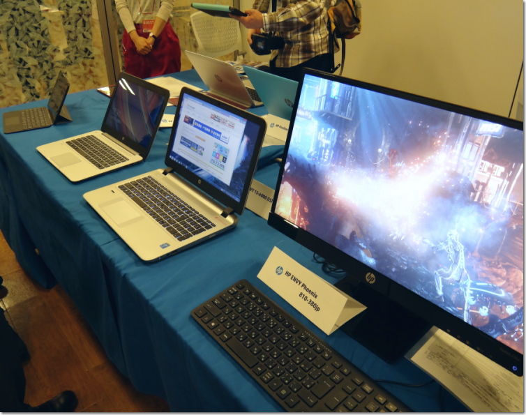 私:「Windows 8 が登場しましたが、HP さんは以前からタッチパネルの開発を進められていたため、Win 8 の機能の活用は得意分野だと思います。 その点はどうでしょうか?」 担:「確かに HP はタッチパネルを以前から作っていました。 ただ、以前のタッチパネルは光学式だったのですが、Windows 8 は光学式では動かし辛いんです。 ですから各製品を静電気式に切り替えている最中です。 パネル自体もより高機能なものに改良中です」 私:「Windows 8 に合わせた新製品などはありますでしょうか?」 担:「もちろん開発を進めておりますが、本格的に出始めるのは来年からになりますね。 今回は Windows 8 にも対応したタッチパネルモニターなどを公開しています。 また、一体型 PC のラインナップを増やしていく予定です」