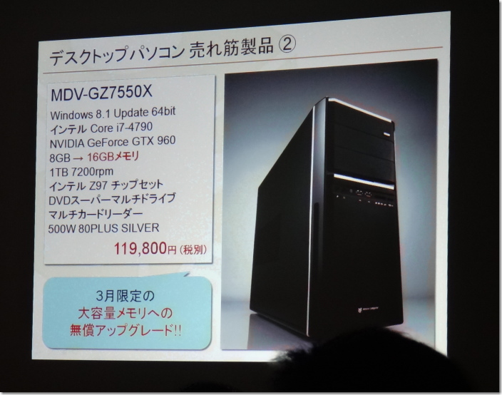 テストでも高いスコアを出しており、さらに消費電力も軽減されていて、非常に良いですね」 私:「あの消費電力とスペックだと『もうコレしかないじゃん』という感じですよね。 NEXTGEAR(ミドルクラスのゲーミングモデル)にも GeForce GTX 980 は積めるんですね」 担:「えぇ、NEXTGEAR は GTX 900、GTX 700、Radeon R9 の各種ビデオカードを選べます」 私:「では MASTERPIECE(大型筐体の最上位モデル)は SLI 用という形になっているのでしょうか?」 担:「いえ、オーバークロックモデルという位置付けになっています」 私:「以前お聞きした時には、G-Tune(ゲーミングモデル)は低価格の NEXTGEAR-Micro が一番売れているとのお話でしたが、その辺は変わってないでしょうか?」 担:「やはりコストパフォーマンスの高いものがよく売れますね。 最近特に売れているのが、ゲーム実況で人気の『裏・顔TV』さんとコラボした裏・顔 TV モデルです。 GeForce GTX 760 を搭載したモデルで、元は Core i5 を使っていましたが、それを Core i7-4790 にするキャンペーンをしており、これを 99800 円で売り出しました。 するとコストパフォーマンスが非常に高いので、ものすごく売れています。 本音を言うと、安すぎてこちらの利益が低いので、むしろ売れすぎて困っています・・・(笑 NEXTGEAR なども Core i7-4790 を 4790K に無償アップグレードするキャンペーンをしています」