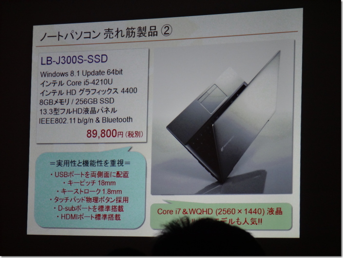 安くて軽いタッチパネル対応ノート(LavBook C シリーズ)の販売も始めましたが、当社としては Win 8 より Windows 7 推しですね」 私:「RADEON R9 シリーズの評判の方はどうなんでしょうか? まだ登場したばかりだから、これからかな?」 担:「そうですね。 販売開始して間がないので、フィードバックが来るのはこれからですね。 もちろんテストはしていて、相応のスコアは出しており、AMD さんも結構売り込みに来られていました。 ただ、GeForce GTX780 Ti も公開されましたからね・・・ (この展示会が行われた当日に GeForce GTX780 Ti が正式発表されました)」 私:「では今はちょうど過渡期といったところなのでしょうか?」 担:「時期的にも年末商戦の準備をしているタイミングです。 本格化するのは、やはり年末ですね」 私:「では売れているモデルなども今は変わっていないのでしょうか? あと、水冷モデルの方はどうだったでしょう? CPU 交換しやすい着脱型水冷モデルの開発を行われていたようですが」 担:「売れ筋はやはり G-Tune NEXT GEAR Micro(6万円から買える安価なゲーミングPC)で、それは変わっていません。 水冷はぼちぼちですね。 着脱しやすい水冷クーラーはまだ開発中です。 やはり難しいですね」 【感想】 それだけに、無理に新モデルを準備しなくても良い状況ということでしょうか? ○ リンク : マウスコンピューター |